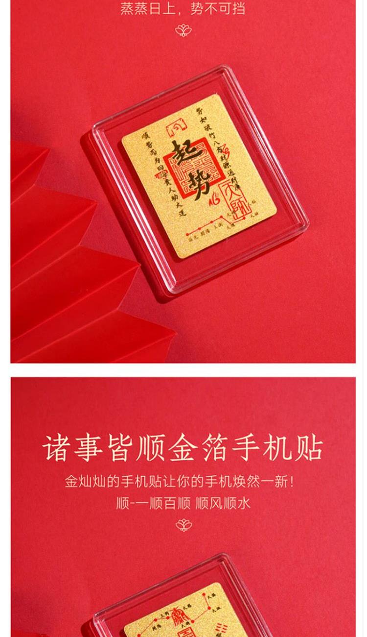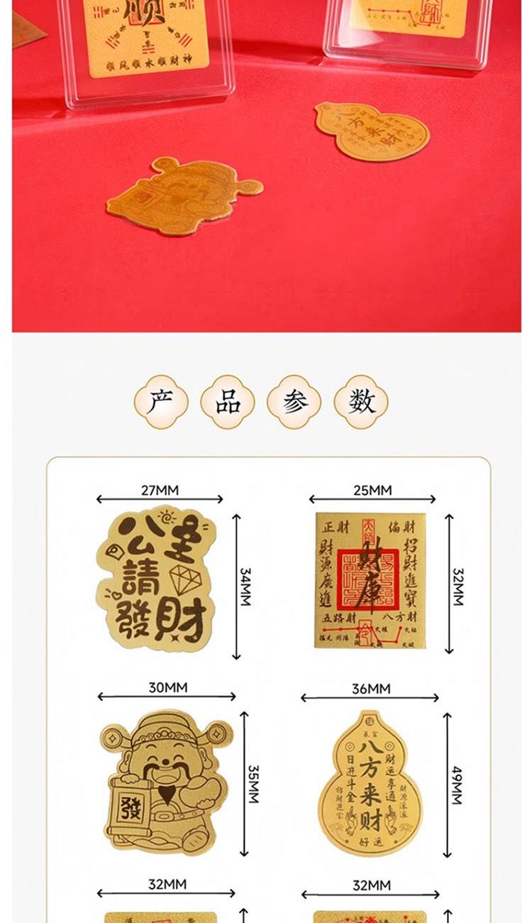 財富與富貴: 直接的含義就是財富、富貴和榮華。貼上財運千金系列,寓意著招財進寶、財源廣進、生意興隆。 吉祥與喜慶: 金色是祥瑞之色,象征著吉祥、光明和輝煌。它能帶來積極向上的能量,寓意著生活幸福美滿,前途光明。 辟邪與護身: 在傳統文化中,黃金被視為純凈、尊貴之物,具有抵擋煞氣、驅邪避兇的作用。金箔雖薄,但也承襲了這一寓意,能為使用者提供守護。