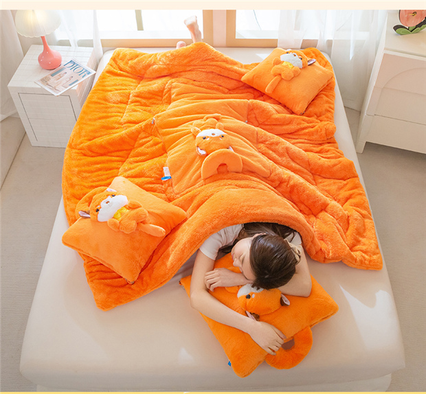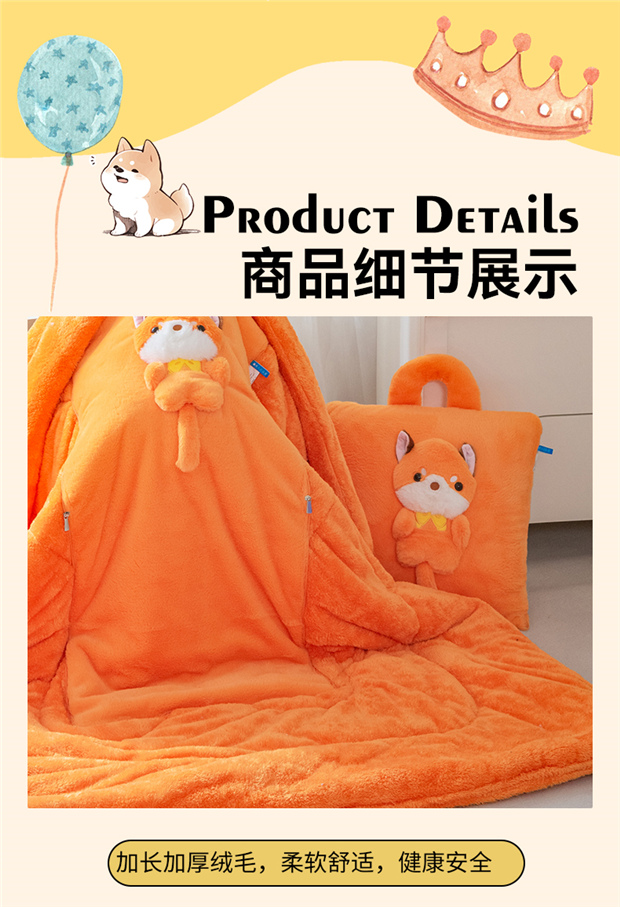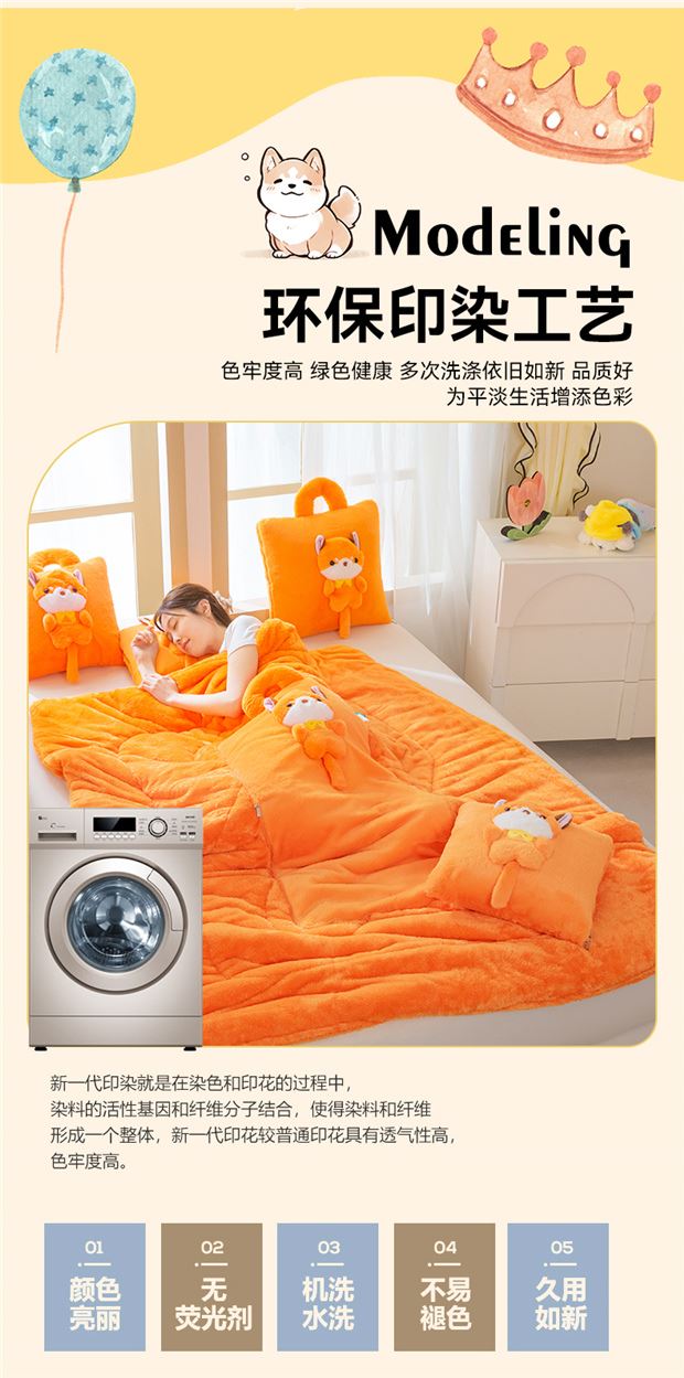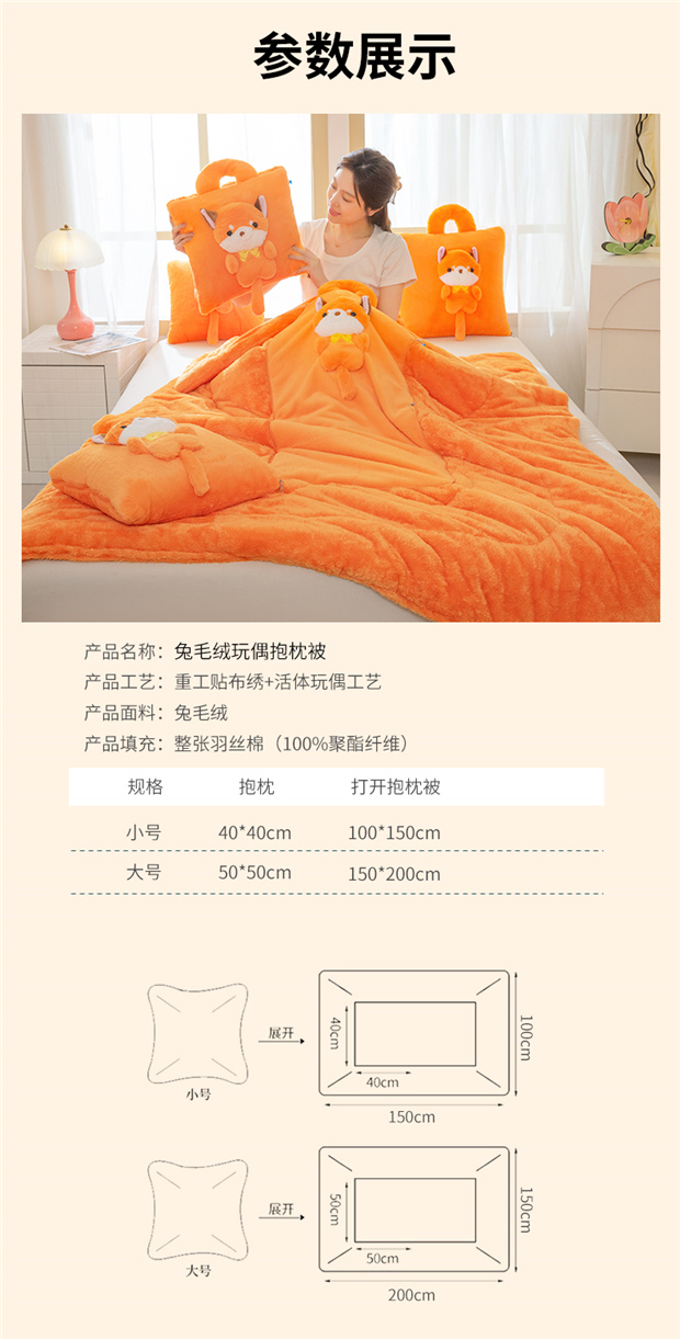 面料:兔毛絨 填充:整張羽絲棉 工藝:重工貼布繡+活體玩偶工藝 尺寸:40*40cm 打開100*150cm