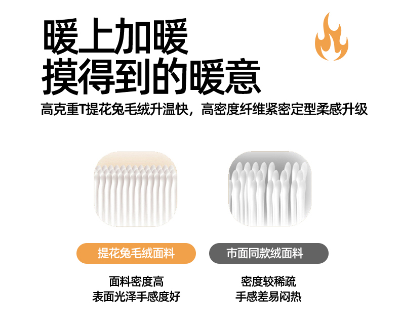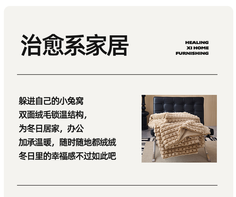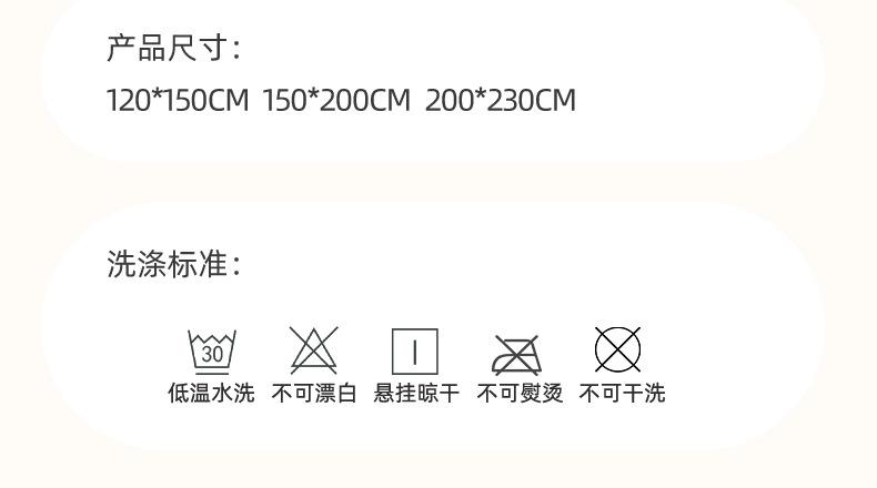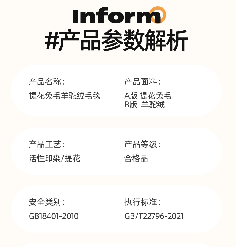 產品賣點:A版提花兔毛絨毛細密 甑選高克重兔毛絨面料 纖維細膩軟糯 親膚 手感柔和且厚實 保暖效果好 暖上加暖 摸得到的暖意 高克重T提花兔毛絨升溫快 高密度纖維緊密定型柔感升級 B版羊駝絨 雙面暖絨打造 鎖溫蓄熱 在毛毯內部形成熱對流 減少熱量流失時刻保持被窩溫度 一毯多用 打破既定格局 潔凈度高 久洗不易褪色 顏色鮮亮
