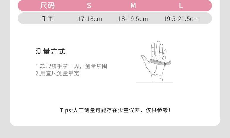 材質 錦綸/尼龍/超纖/硅膠 顏色 魔力黑 尺寸 S:17-18cm/M:18-19.5cm/L:19.4-21.5cm 重量 約46g/副(兩只) 防滑耐磨,透氣輕盈,適合多種運動,保護您的雙手 彈性透氣面料,液態硅膠防滑珠,快脫小耳設計 立體掌墊,緊致貼合,強力抓握,彎曲自如 輕量無感,全掌透氣,無負重 液態硅膠防滑掌墊,3MM加厚按摩點式液態硅膠護墊,減震按摩,有效防滑