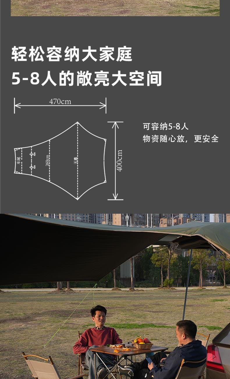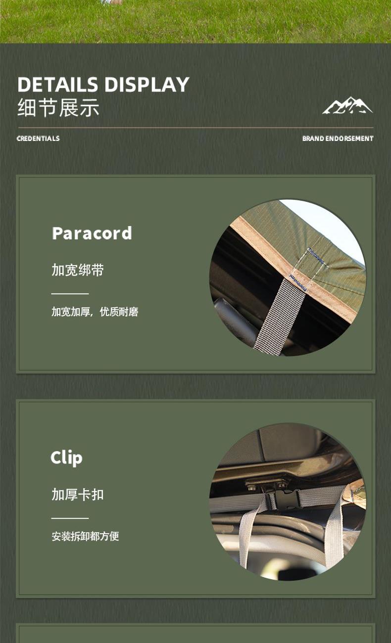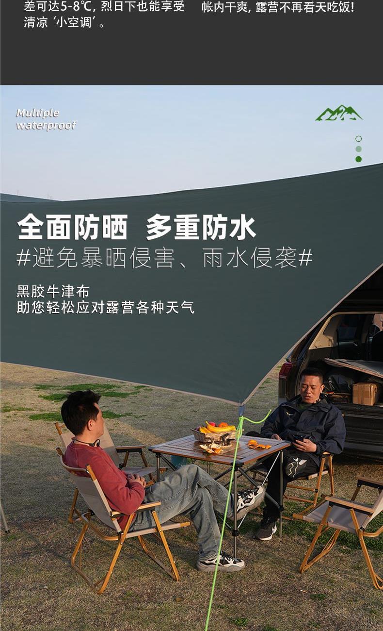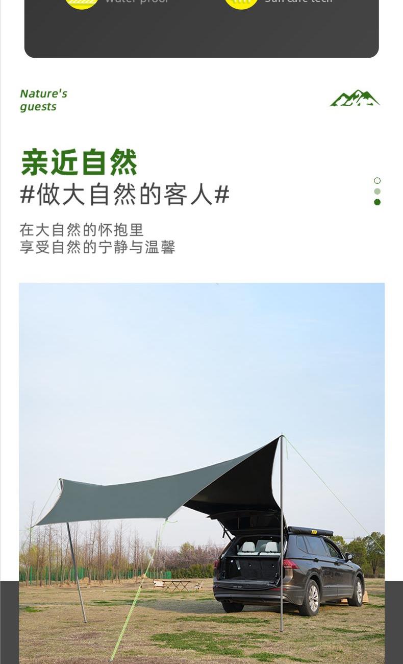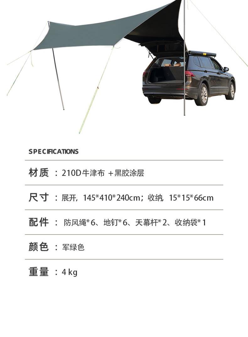 材質 210D牛津布 涂黑膠 顏色 墨綠 尺寸 展開 145*410*240cm 收納 15*15*66cm 重量 3.05kg 配件 防風繩*4、地釘*4、天幕桿*2、收納袋*1 快裝快收,不限車型 超大這樣面積,有效阻擋紫外線,無懼曬黑 寬敞視野 旅途景觀 多種搭建形態,根據陽光照射角度調整,增加露營舒適度 防雨拒水效果出眾