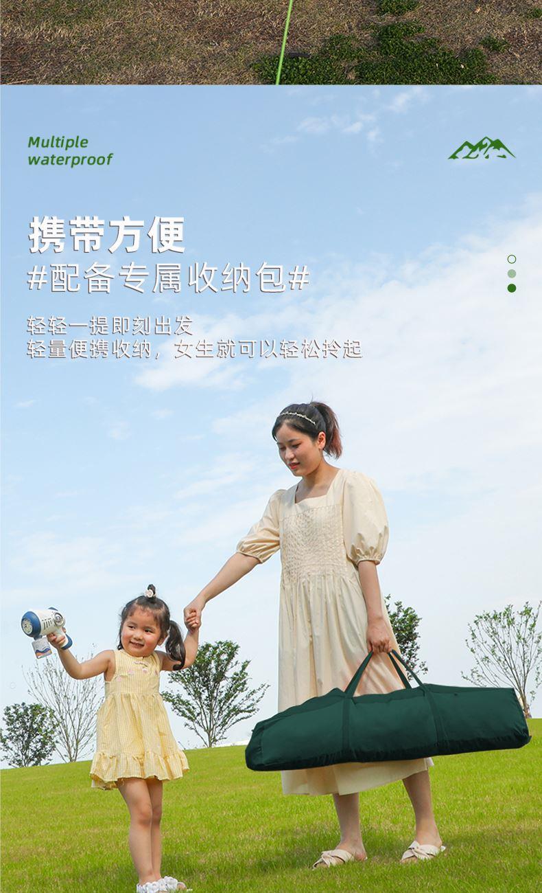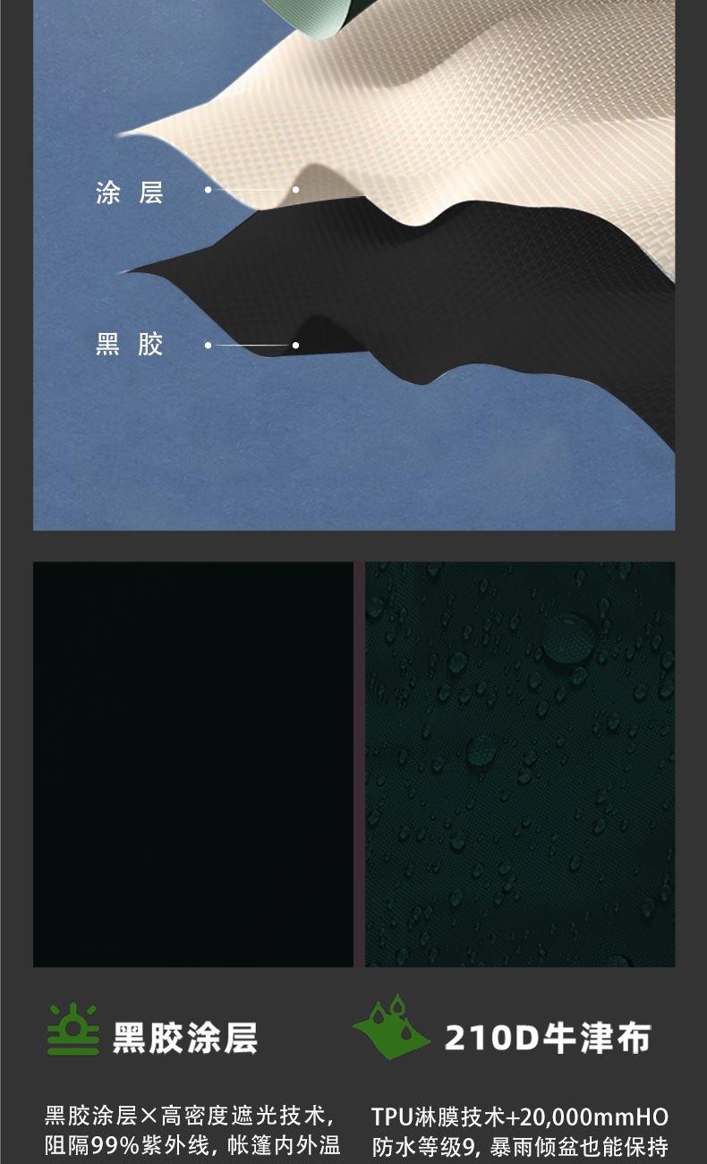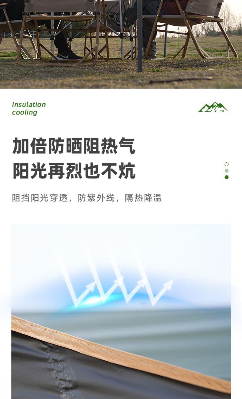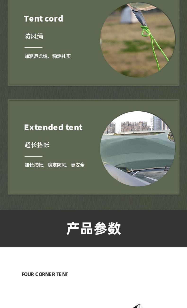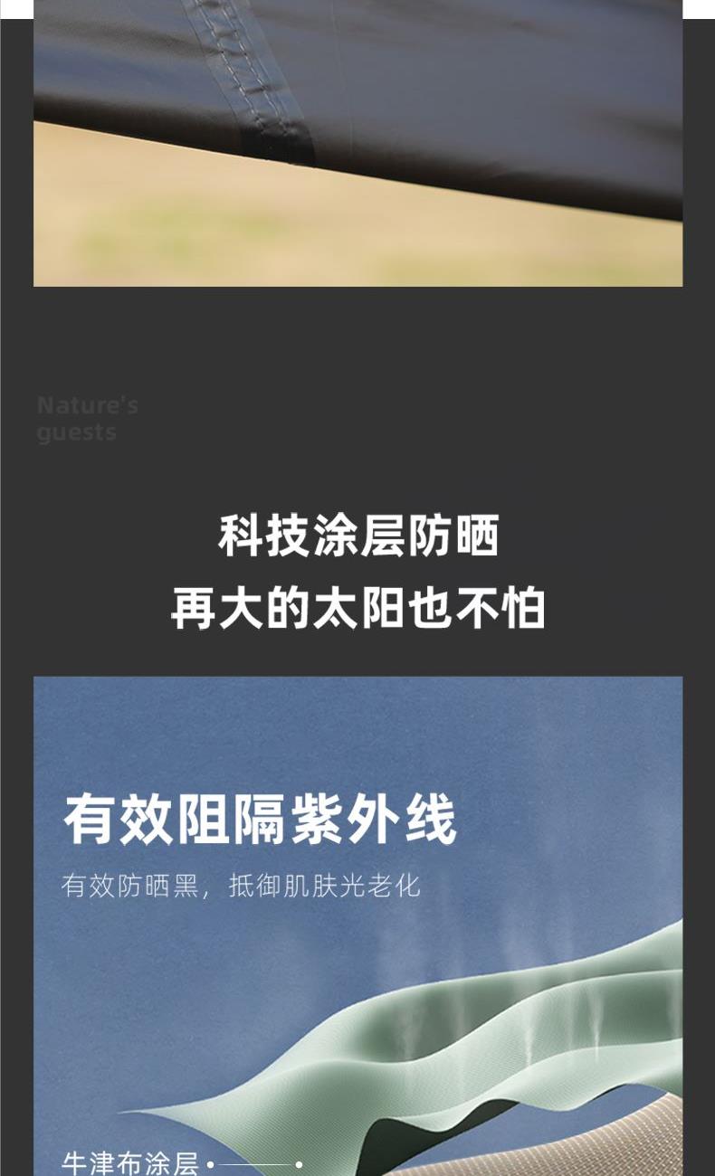 材質 210D牛津布 涂黑膠 顏色 墨綠 尺寸 展開 145*410*240cm 收納 15*15*66cm 重量 3.05kg 配件 防風繩*4、地釘*4、天幕桿*2、收納袋*1 快裝快收,不限車型 超大這樣面積,有效阻擋紫外線,無懼曬黑 寬敞視野 旅途景觀 多種搭建形態,根據陽光照射角度調整,增加露營舒適度 防雨拒水效果出眾