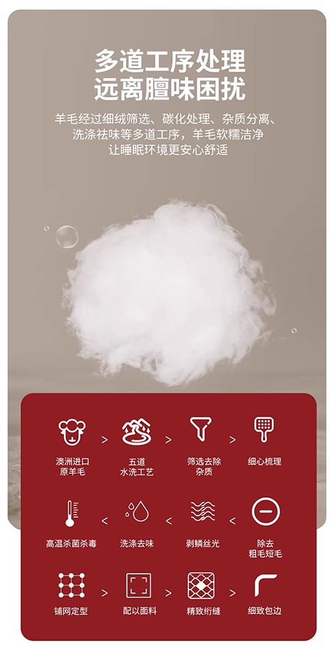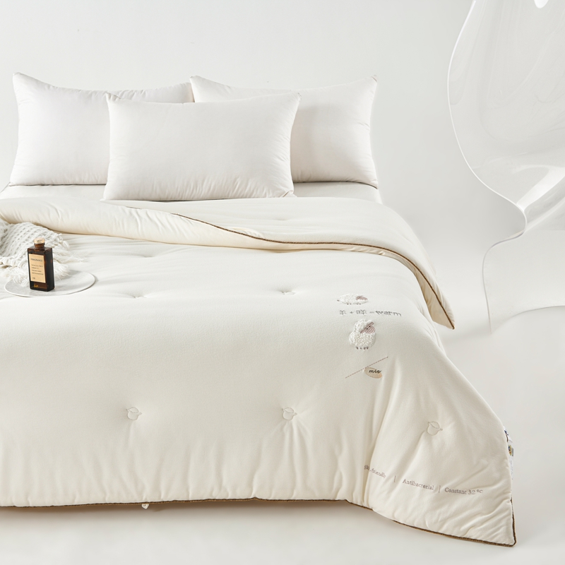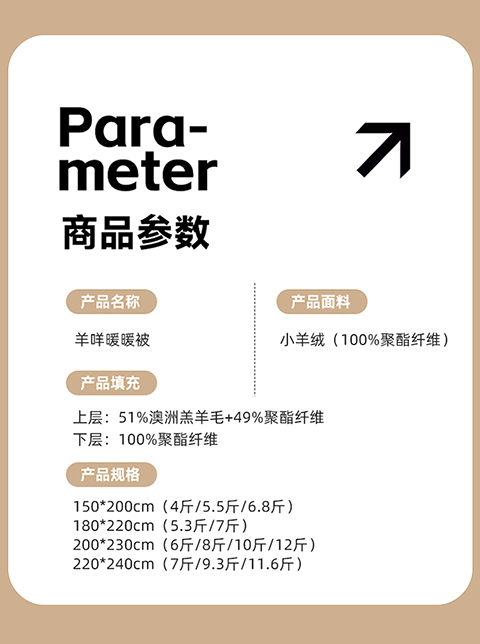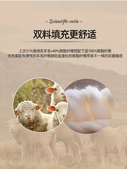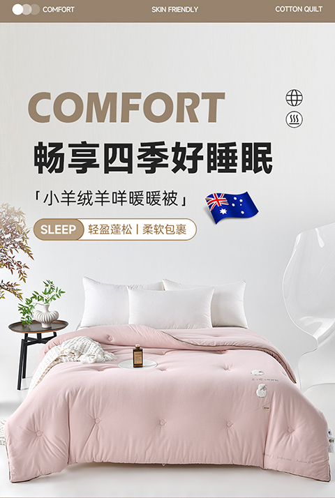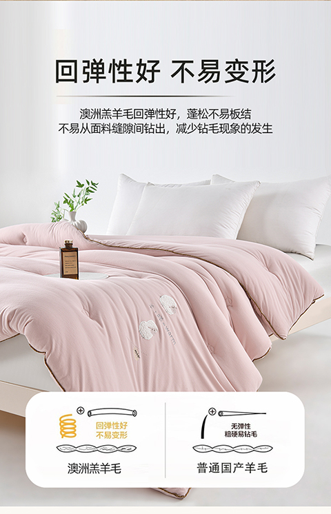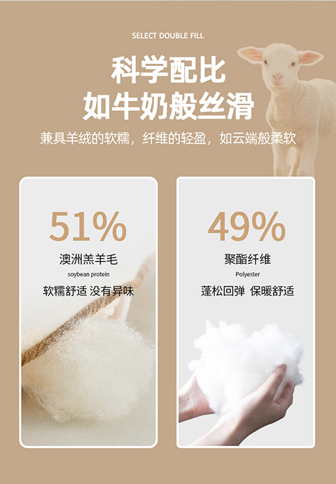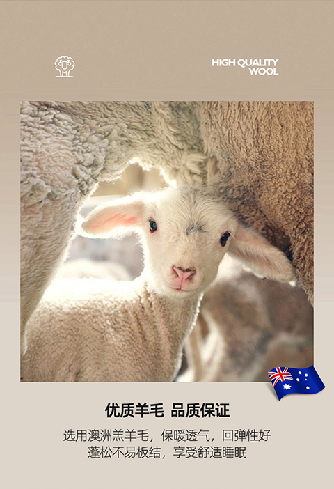 面料:小羊絨 填充:51%澳洲羔羊毛+49%聚酯纖維 規(guī)格:2.0m 6斤 保暖舒適,樂享品質(zhì)睡眠 多道工藝,羊毛潔凈凈化處理,褪去雜志,質(zhì)地升華。 輕盈透氣蓬松,蓄暖排濕,輕柔不壓身。 加厚防雨布,防鉆毛。