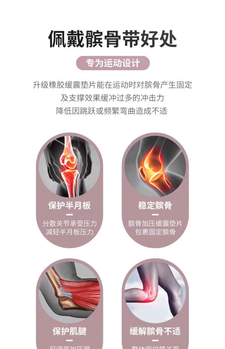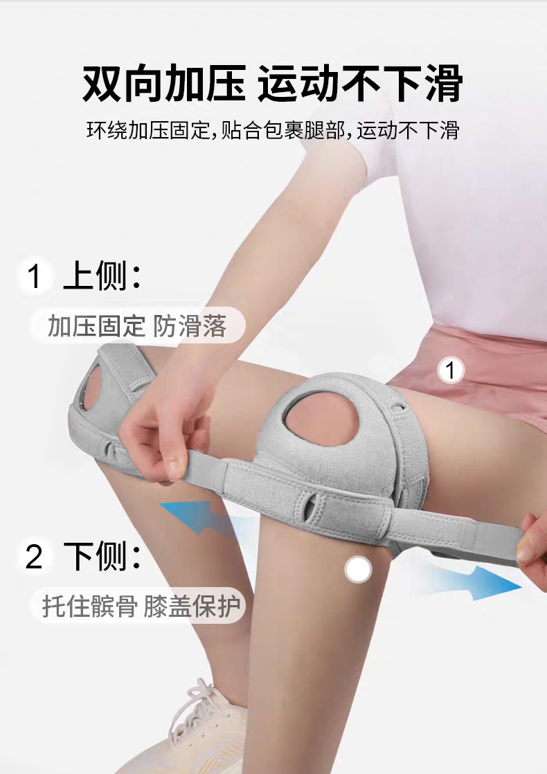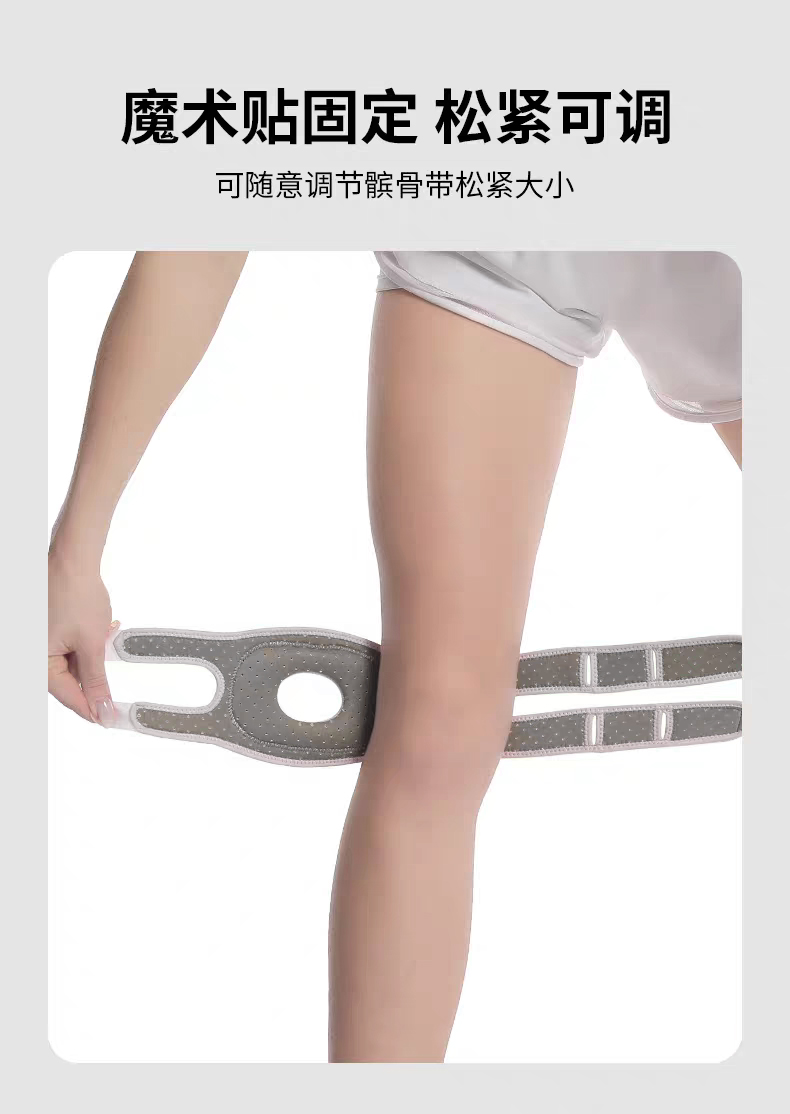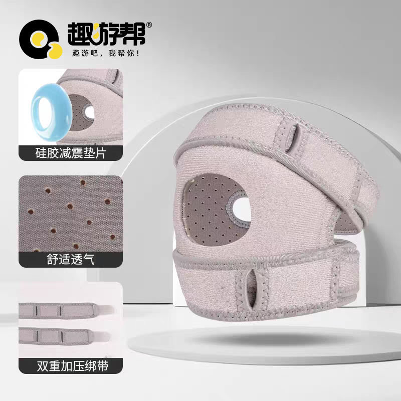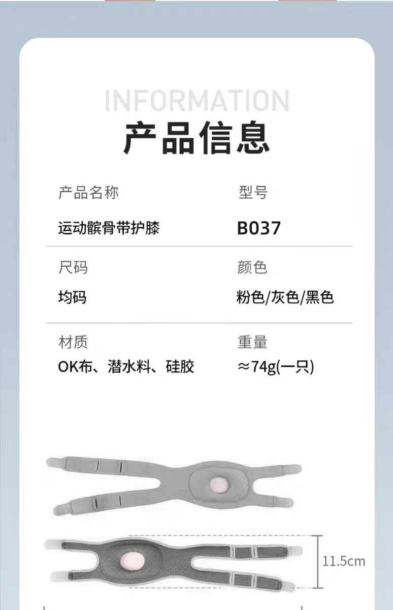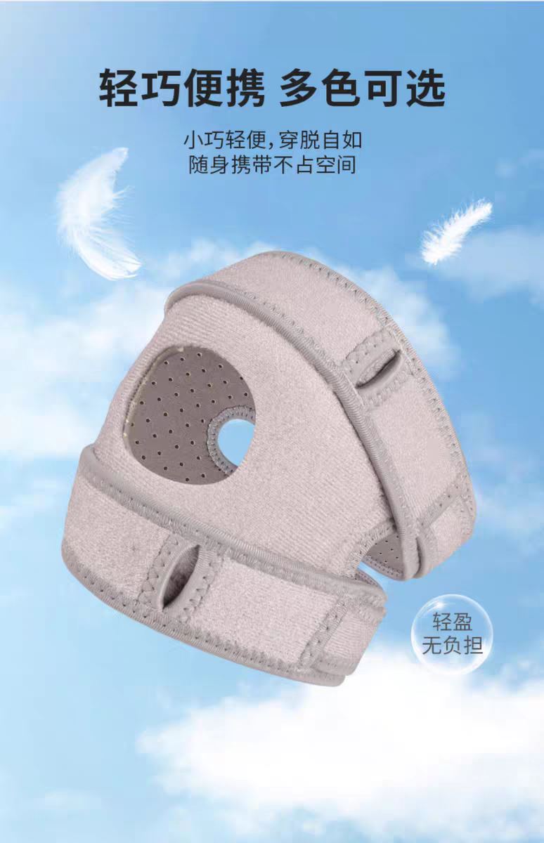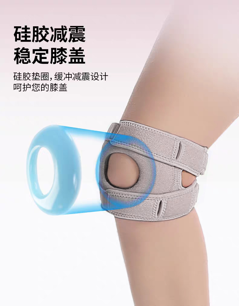 材質 硅膠圈 ok布 顏色 淺灰色 尺寸 53*10cm 重量 0.1kg 專為運動設計 升級硅膠緩震墊片能在運動時對臏骨產生固定 支撐效果強,能緩沖過多的沖擊力 降低因跳躍或頻繁彎曲造成不適