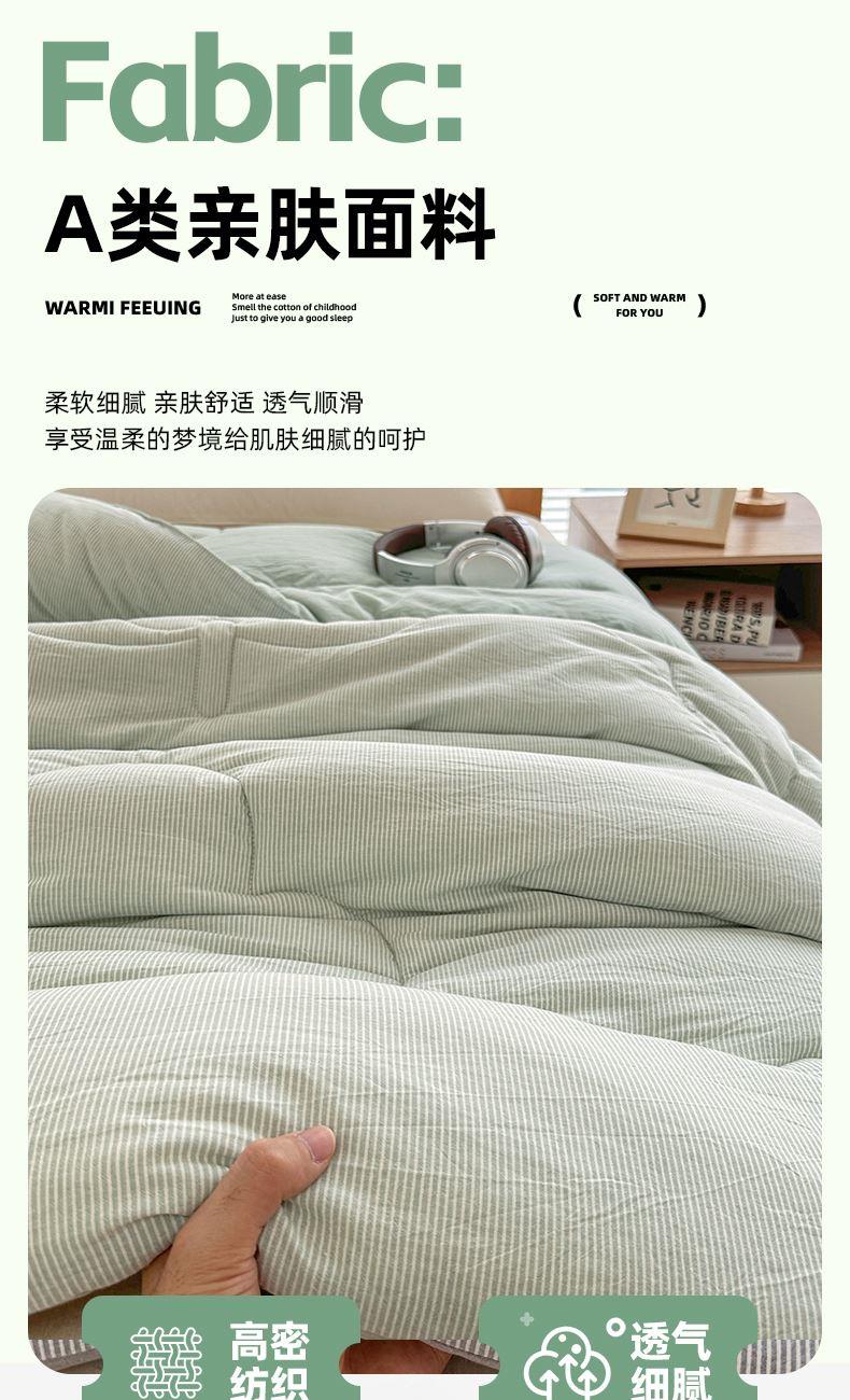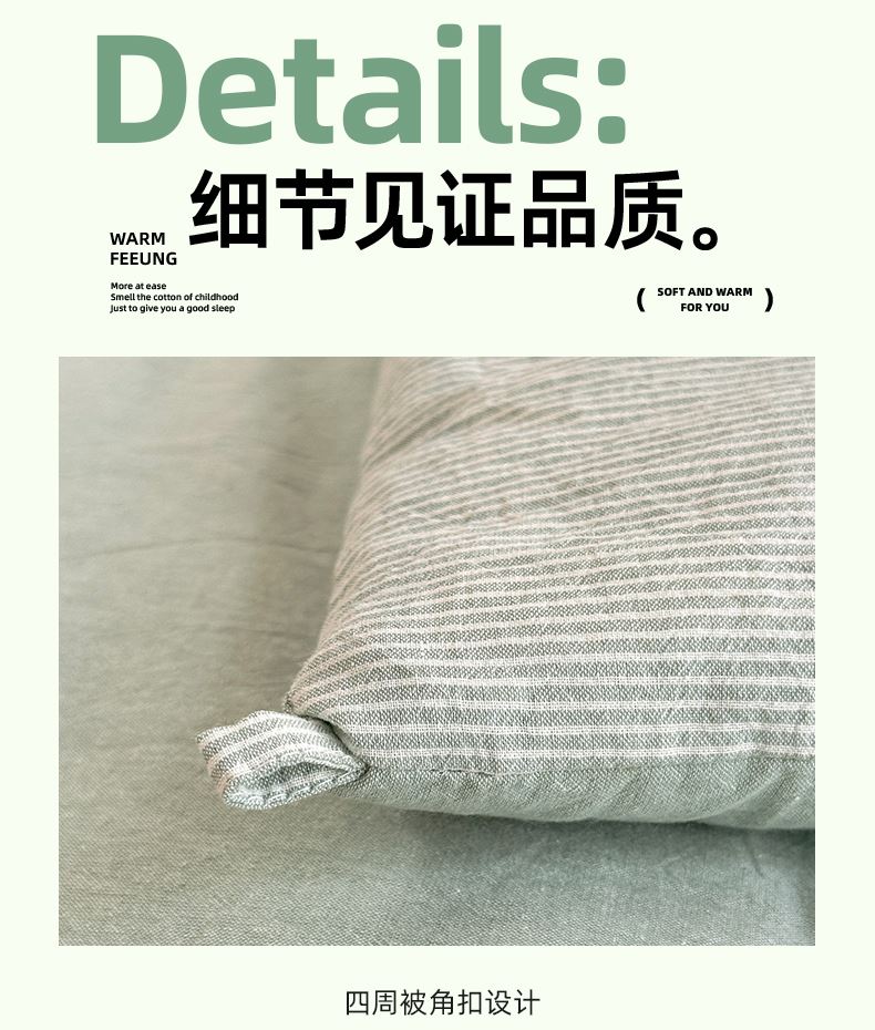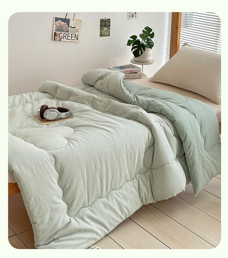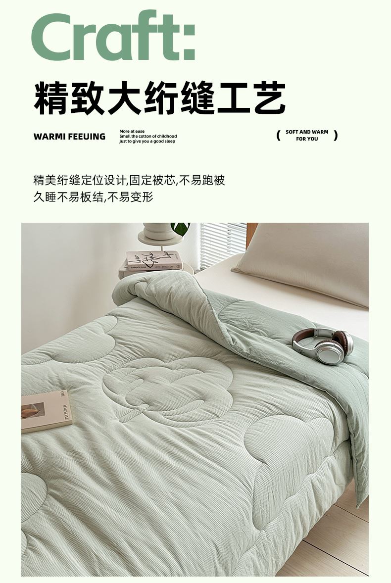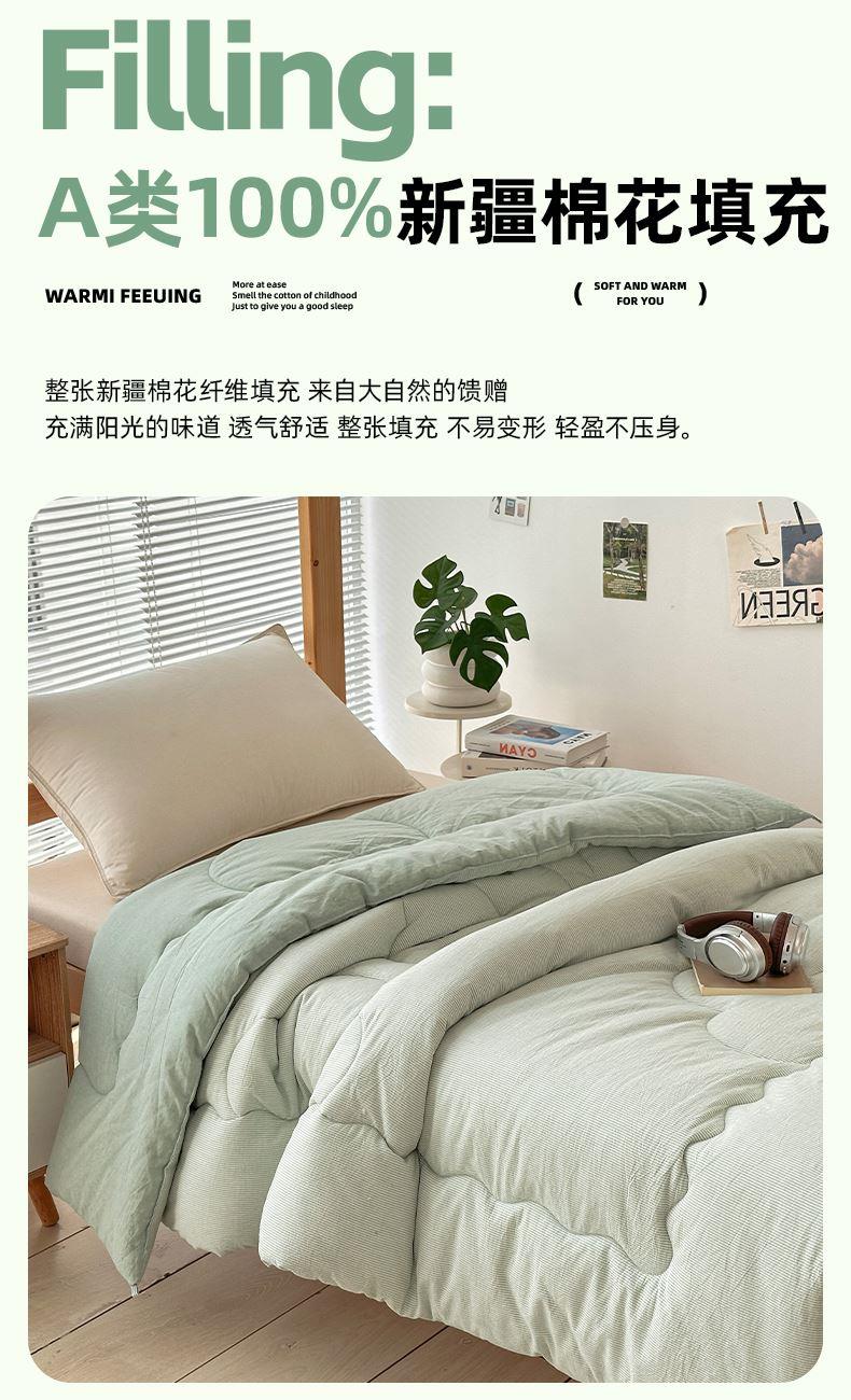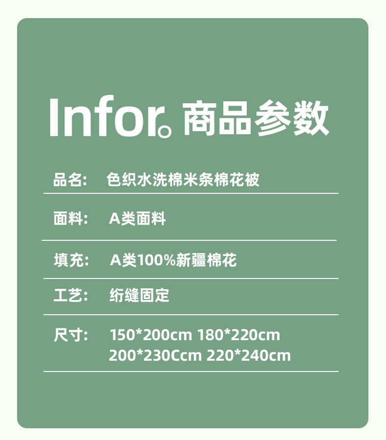 產品規格:150*200cm(4斤) 花色:豆綠、卡其、深灰、脂粉 面料:色織水洗棉 填充物:聚酯纖維 產品賣點:整張新疆棉花纖維填充 來自大自然的饋贈,充滿陽光的味道,透氣舒適,整張填充,不易變形,輕盈不壓身,精美絎縫定位設計,固定被芯,不易跑被,久睡不易板結,不易變形