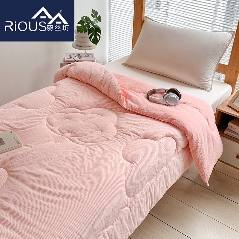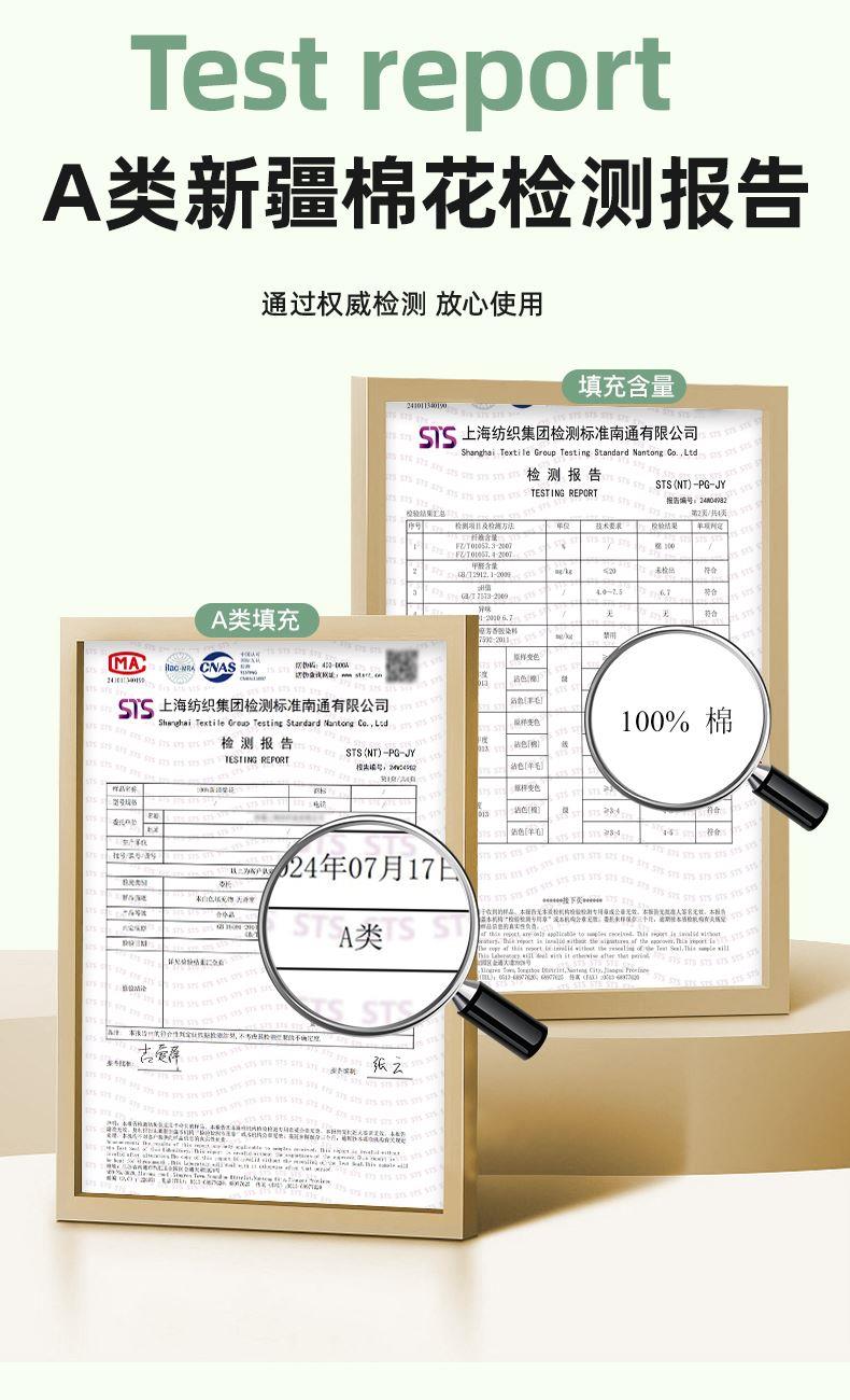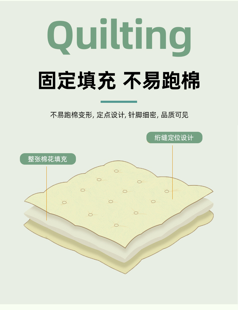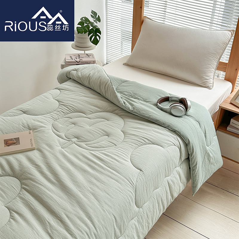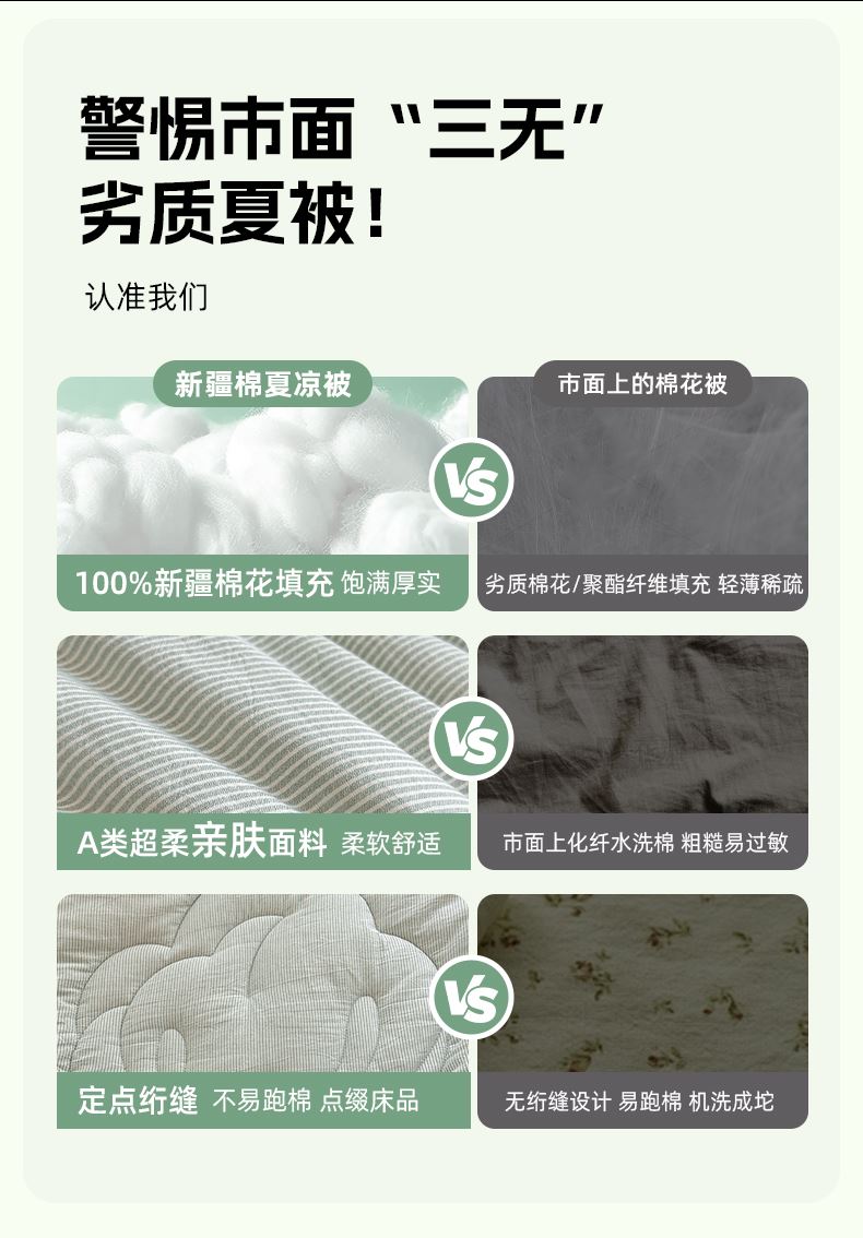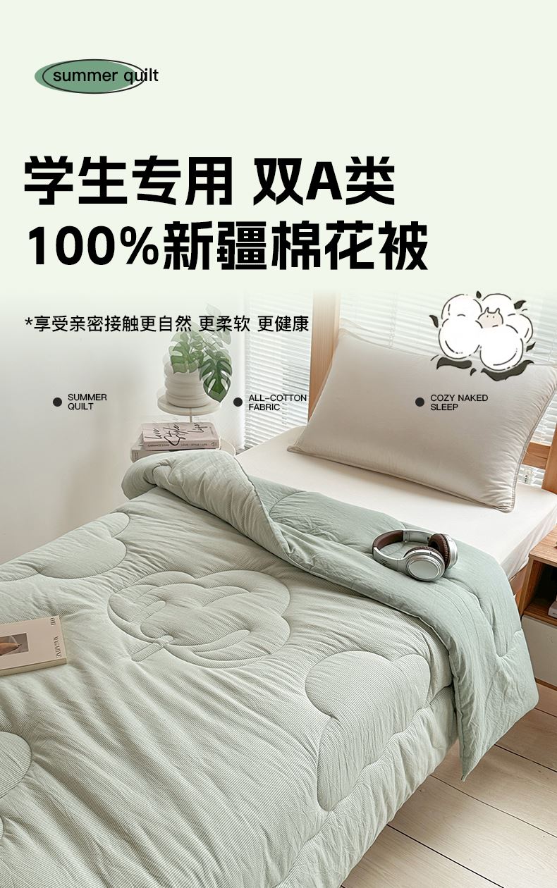產品規格:150*200cm(4斤) 花色:豆綠、卡其、深灰、脂粉 面料:色織水洗棉 填充物:聚酯纖維 產品賣點:整張新疆棉花纖維填充 來自大自然的饋贈,充滿陽光的味道,透氣舒適,整張填充,不易變形,輕盈不壓身,精美絎縫定位設計,固定被芯,不易跑被,久睡不易板結,不易變形