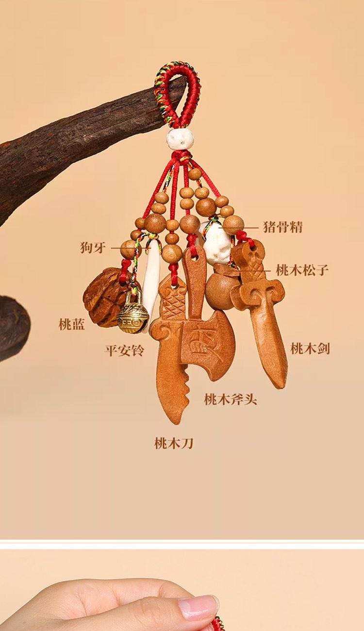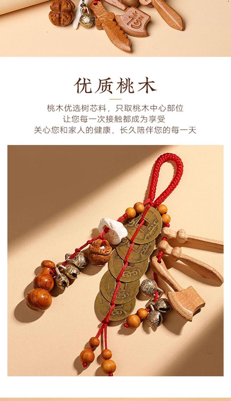 雙重辟邪,萬煞不侵: 老桃木從材質上提供強大的辟邪能量,如同一位法力高強的法師;而五帝錢則憑借其盛世皇氣,專門負責抵擋和化解各種煞氣。兩者結合,形成了無可匹敵的防護組合,寓意著為家庭或個人建立一個堅不可摧的保護磁場,強力抵御一切負面能量和邪祟的侵擾。 家宅安寧,運勢昌隆: 懸掛于家中或車內,象征著凈化整個環境的磁場,保佑家人身體健康,家庭和睦,運勢興旺。