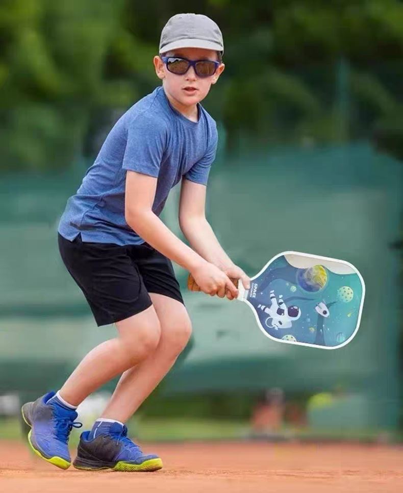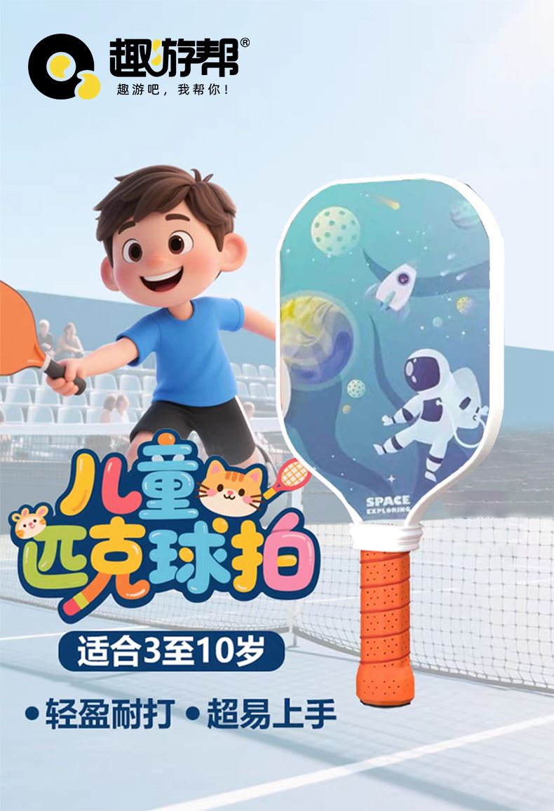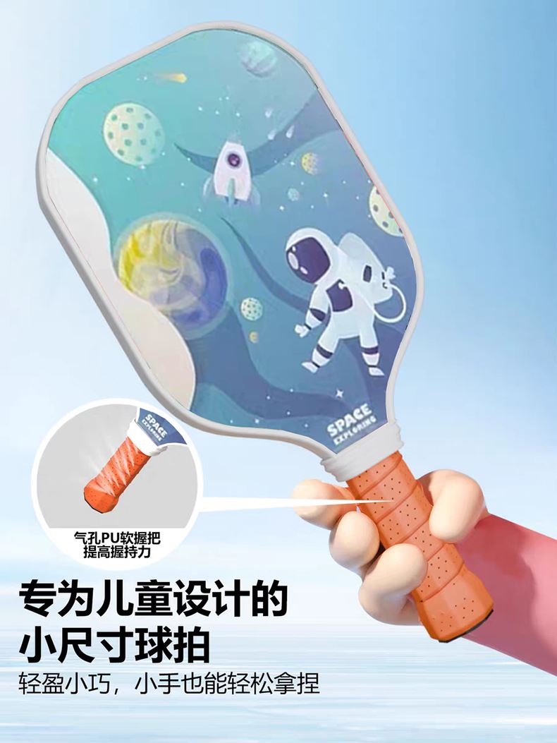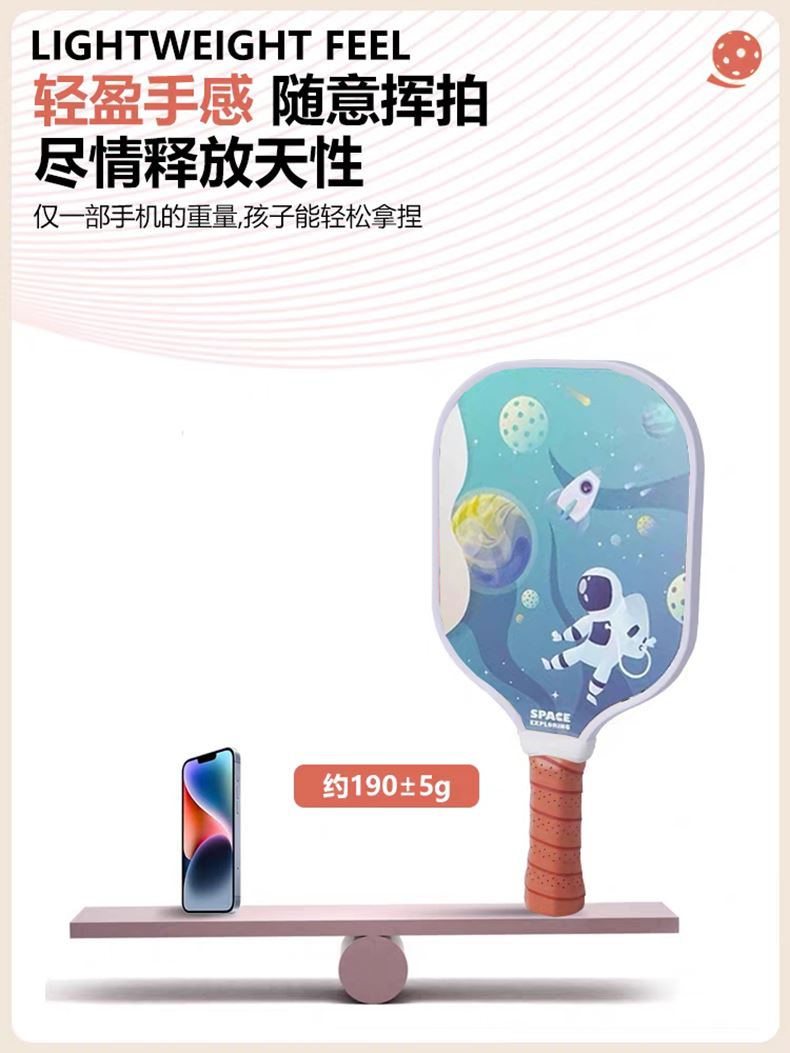 材質 玻璃纖維+pp蜂窩 重量 187-196g 尺寸 35*18*1cm 顏色 太空遨游 配件 1兒童拍+1個回彈訓練球+1個常規球+1收納包+1紙盒 PP蜂窩芯吸震層,吸收60%沖擊力,給手腕戴上“隱形護腕” 圓角拍框+熒光邊,防撞傷設計,夜間20米可見,防誤傷 玻纖層高反彈,甜區回彈率92%,接近成人賽拍,弱發力也能回擊過網 回彈球,告別“撿球挫敗感”
