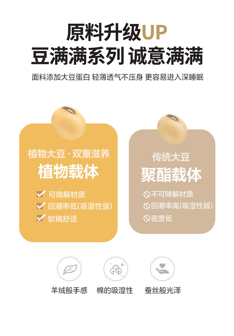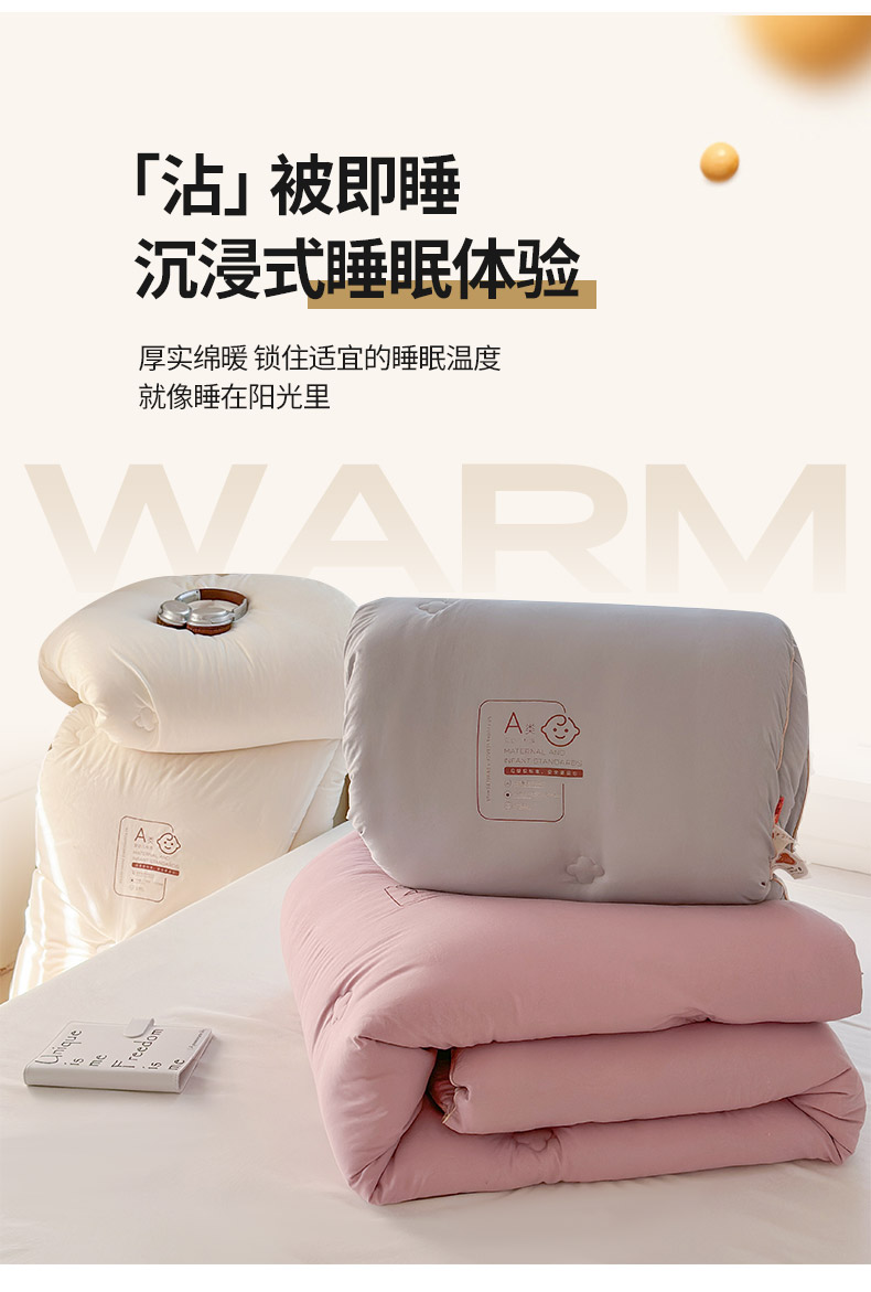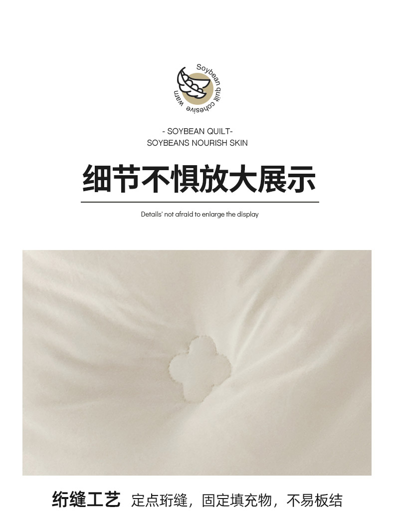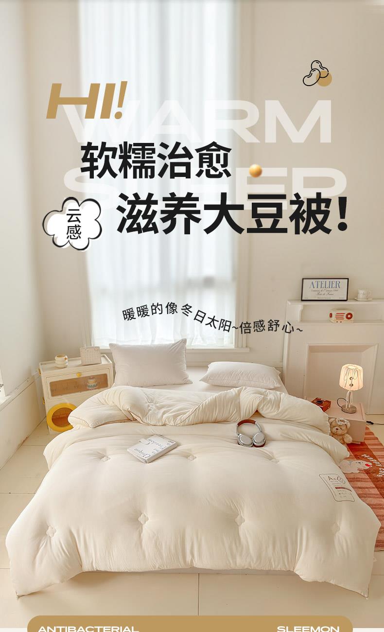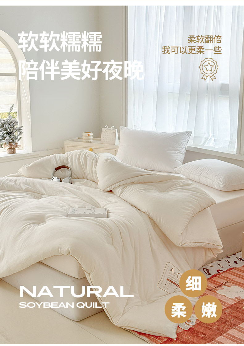 產(chǎn)品規(guī)格:180*220cm(6斤) 花色:baby-米白、baby-豆沙、baby-英灰 面料:聚酯纖維 填充物:10%聚酯纖維90%聚酯纖維 產(chǎn)品賣點(diǎn):軟糯滋養(yǎng)大豆被,暖暖的像冬日太陽,倍感舒心。纖維整張?zhí)畛洌D贪銣貪櫍笟獠粣灍帷8呖酥孛媪希灰灼鹎颍H膚柔軟。