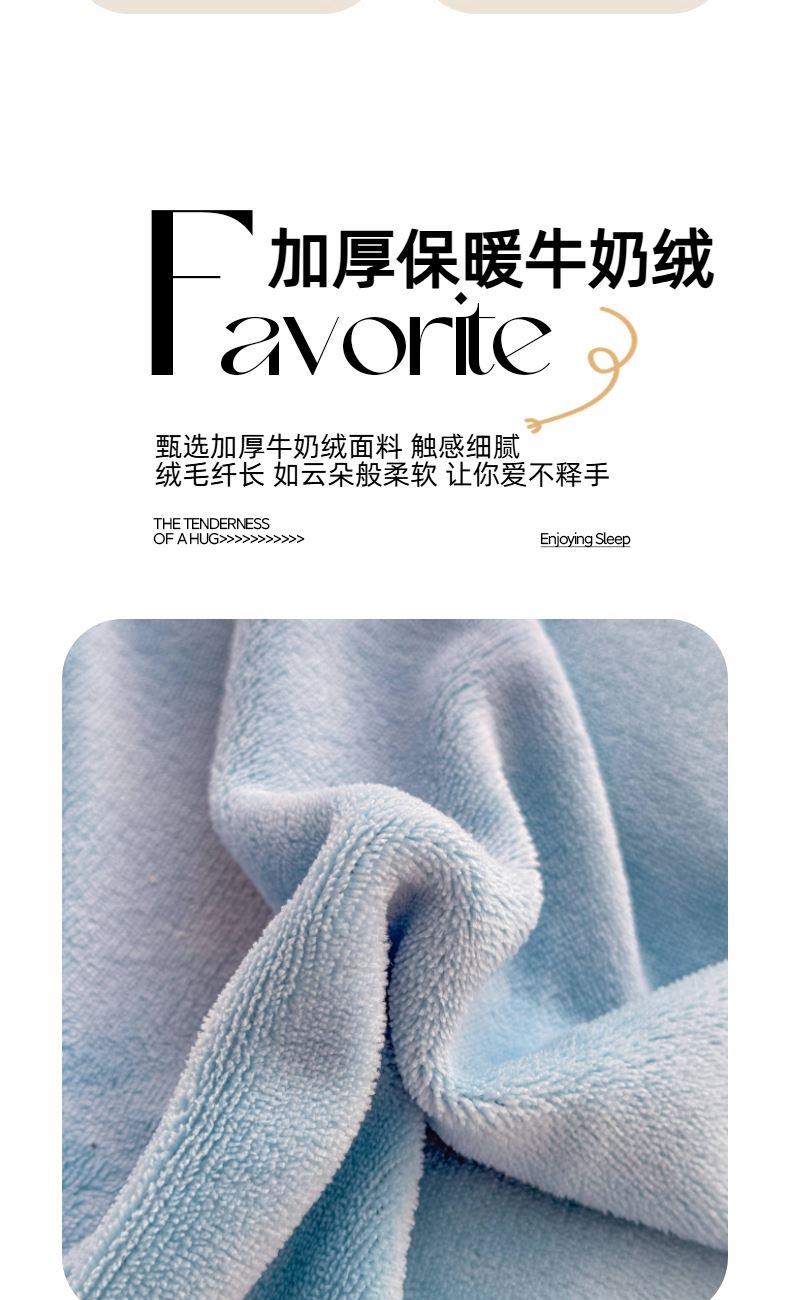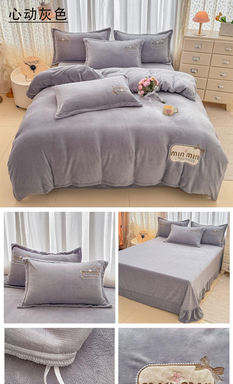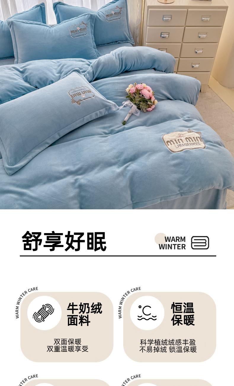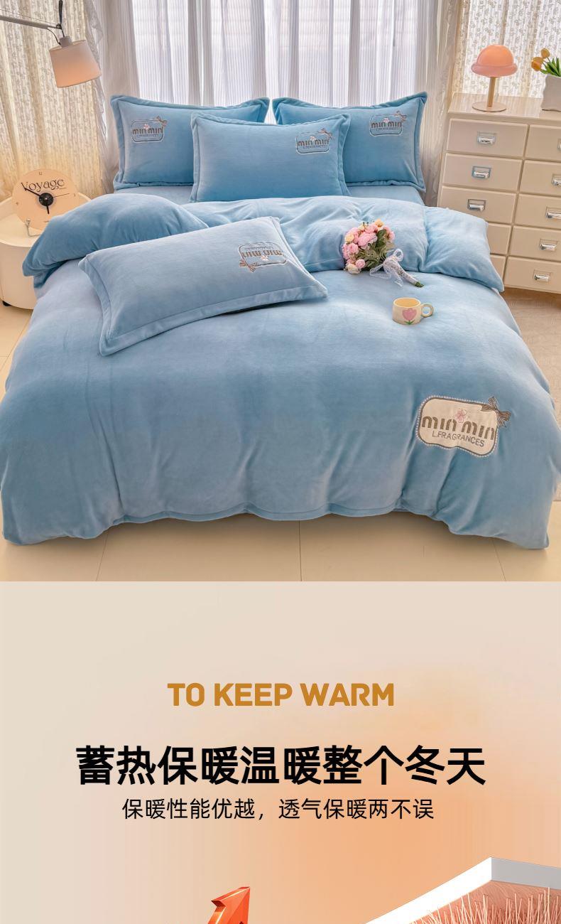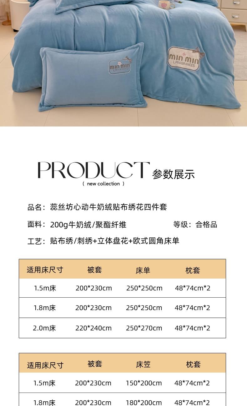 面料:200克牛奶絨 工藝:貼布繡/刺繡+立體盤花+歐式圓角床單 花色:心動紫、心動玉色、心動天藍、心動灰、心動粉 規(guī)格:1.5米-1.8米床適用 被套200*230cm*1 床單230*245cm*1 枕套48*74cm*2 賣點:選用200g牛奶絨?質(zhì)地蓬松?透氣性好?溫暖舒適 精美貼布繡/刺繡搭配立體盤花, 升溫迅速,速暖控溫,牛奶絨面料絨毛密度小,卷曲度低,能夠防止熱量散失。在逐漸變冷的秋冬季節(jié),暖和的像戀人的擁抱。