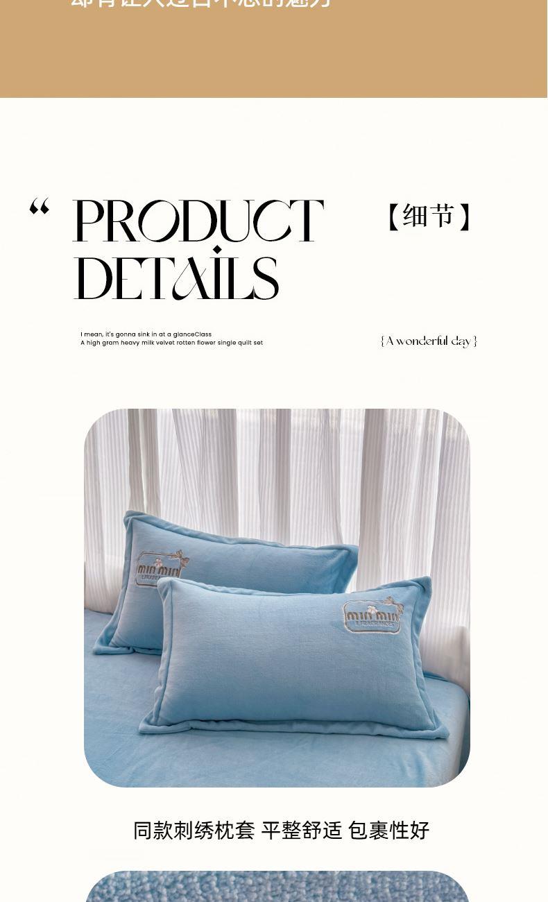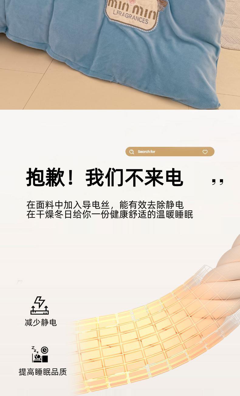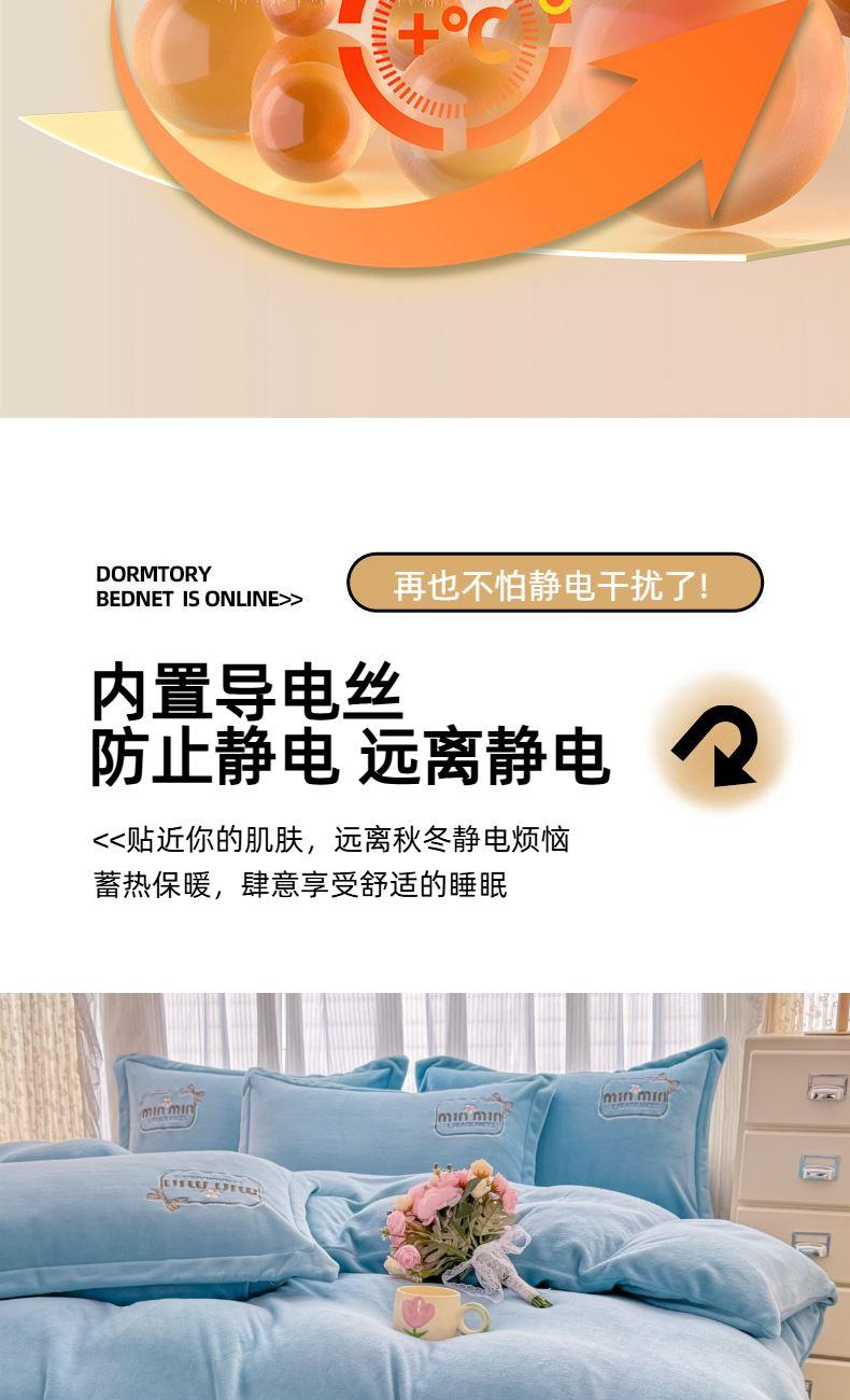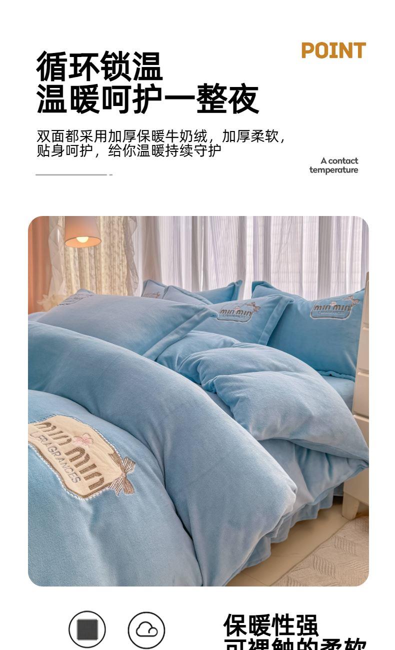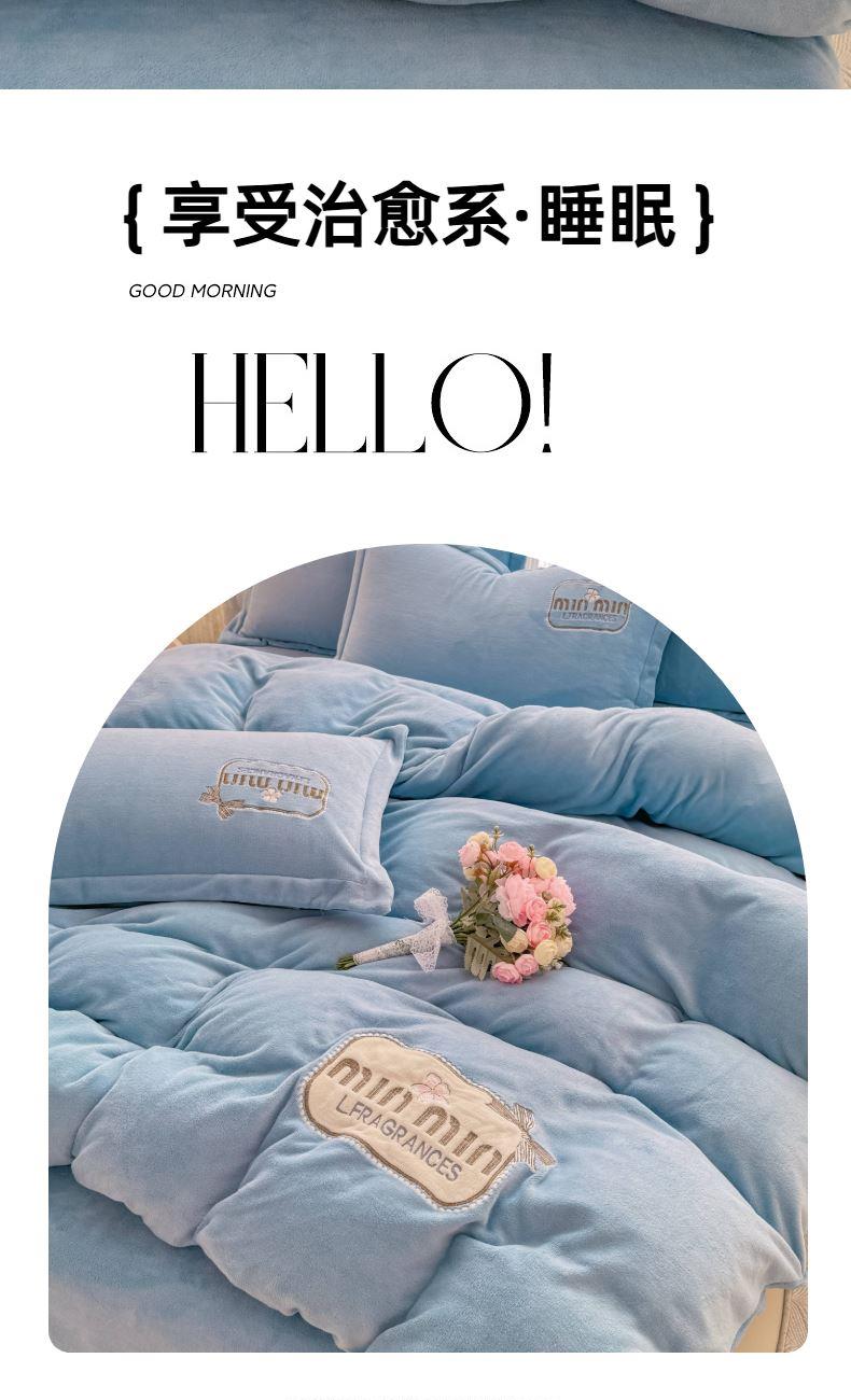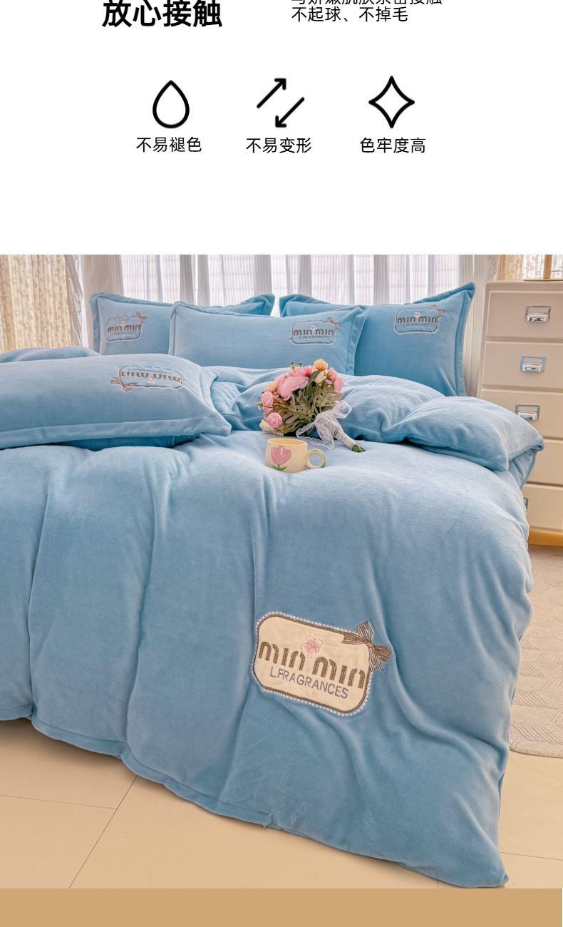 面料:200克牛奶絨 工藝:貼布繡/刺繡+立體盤花+歐式圓角床單 花色:心動紫、心動玉色、心動天藍、心動灰、心動粉 規(guī)格:1.5米-1.8米床適用 被套200*230cm*1 床單230*245cm*1 枕套48*74cm*2 賣點:選用200g牛奶絨?質(zhì)地蓬松?透氣性好?溫暖舒適 精美貼布繡/刺繡搭配立體盤花, 升溫迅速,速暖控溫,牛奶絨面料絨毛密度小,卷曲度低,能夠防止熱量散失。在逐漸變冷的秋冬季節(jié),暖和的像戀人的擁抱。